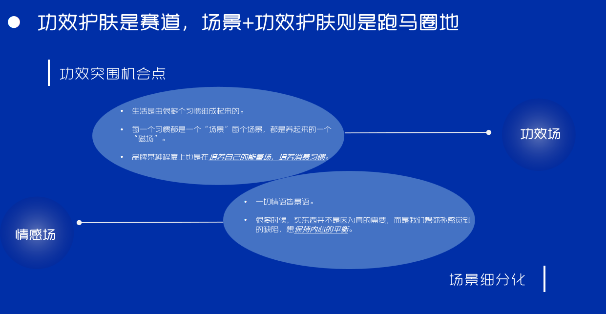 李婷在演講中分享了她的觀點(diǎn):功效賽道的研發(fā)科技+成分濃度+護(hù)膚概念已經(jīng)卷到?jīng)]邊,與其被動(dòng)卷,不如主動(dòng)“圈地”。璦爾博士認(rèn)為功效護(hù)膚是賽道,場(chǎng)景+功效護(hù)膚則是跑馬圈地。當(dāng)我們談熬夜賽道的時(shí)候其實(shí)在談熬夜后的消費(fèi)者的生理需求和心理需求,是功效場(chǎng)和情感場(chǎng)的互動(dòng)。一方面需要注意到消費(fèi)者熬夜后肌膚狀態(tài)的變化,另一方面也要洞察消費(fèi)者熬夜后心理狀態(tài)的變化。用功效場(chǎng)和情感場(chǎng)的互動(dòng),完成和消費(fèi)者的靈魂共振。