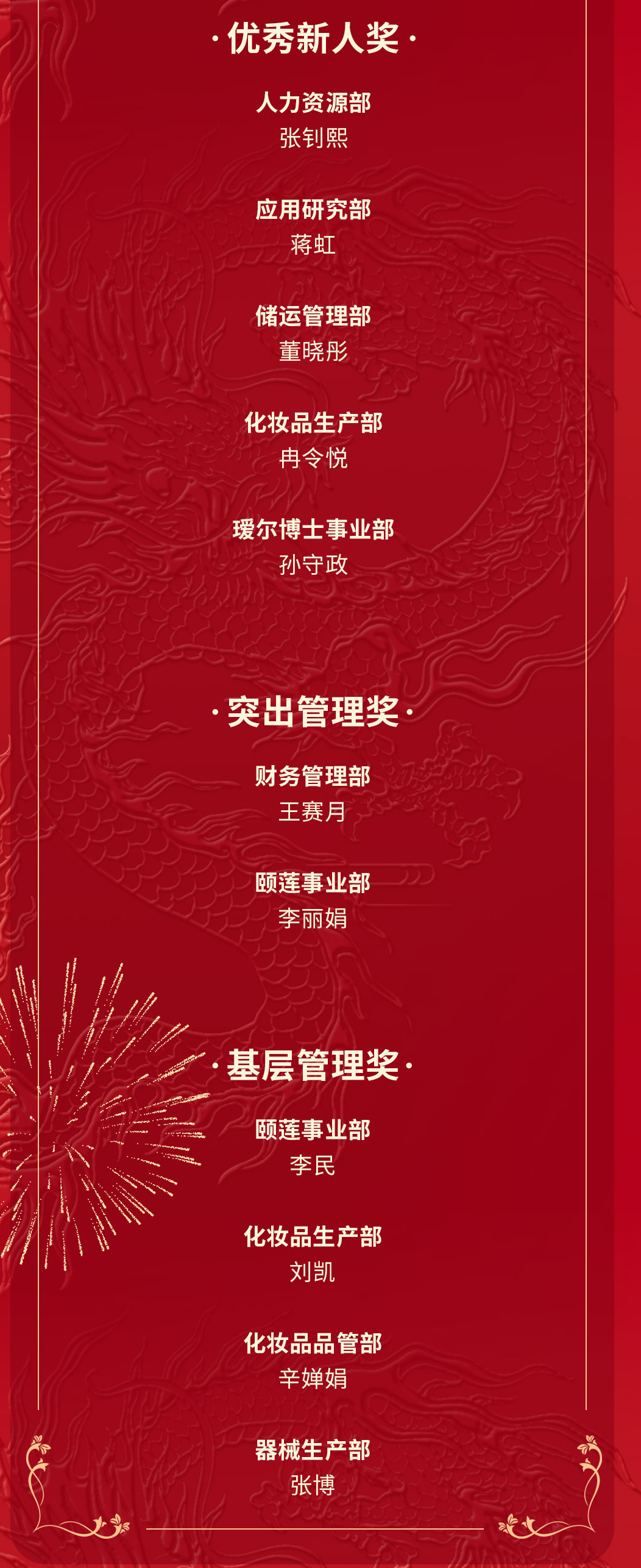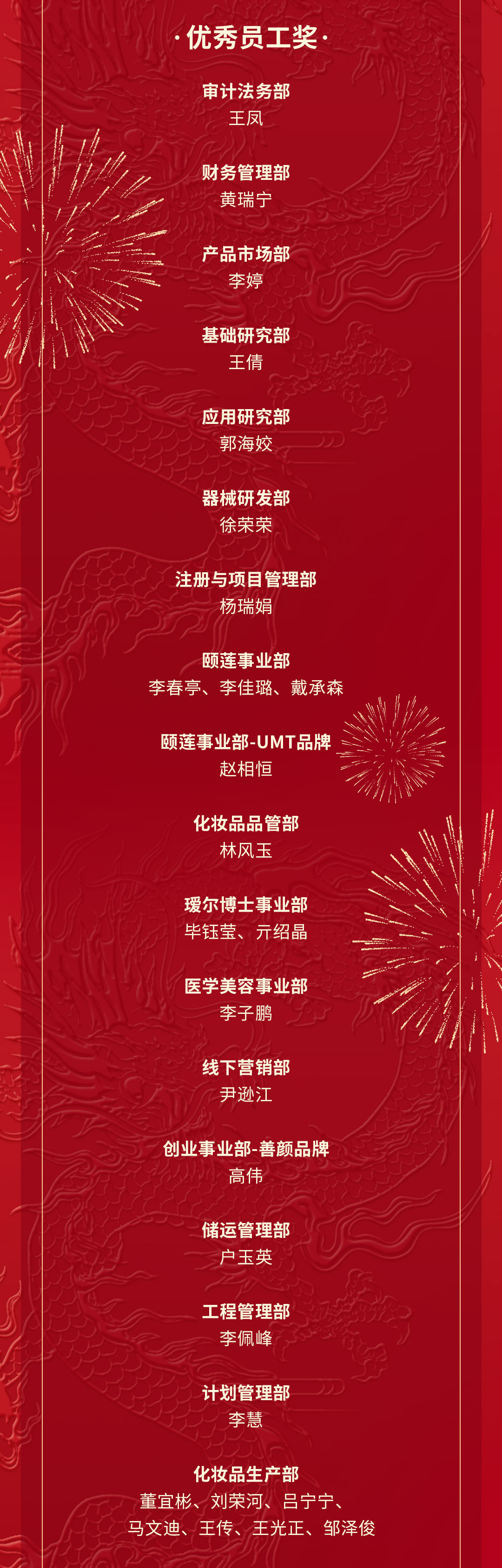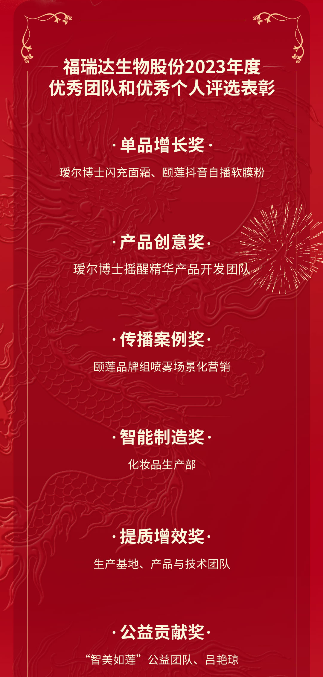 這一年,公司各部門(mén)涌現(xiàn)出一批充分發(fā)揮奮斗精神和主觀能動(dòng)性干事創(chuàng)業(yè)的團(tuán)隊(duì)和員工。人力資源部近日組織開(kāi)展2023年度優(yōu)秀團(tuán)隊(duì)和優(yōu)秀個(gè)人評(píng)選,共評(píng)出單品增長(zhǎng)、產(chǎn)品創(chuàng)意、傳播案例獎(jiǎng)、智能制造、提質(zhì)增效、公益貢獻(xiàn)六個(gè)團(tuán)隊(duì)獎(jiǎng)和優(yōu)秀員工、優(yōu)秀新人、突出管理、基層管理、公益貢獻(xiàn)五個(gè)個(gè)人獎(jiǎng)。會(huì)上,對(duì)福瑞達(dá)生物股份2023年度優(yōu)秀團(tuán)隊(duì)和優(yōu)秀個(gè)人進(jìn)行了表彰。