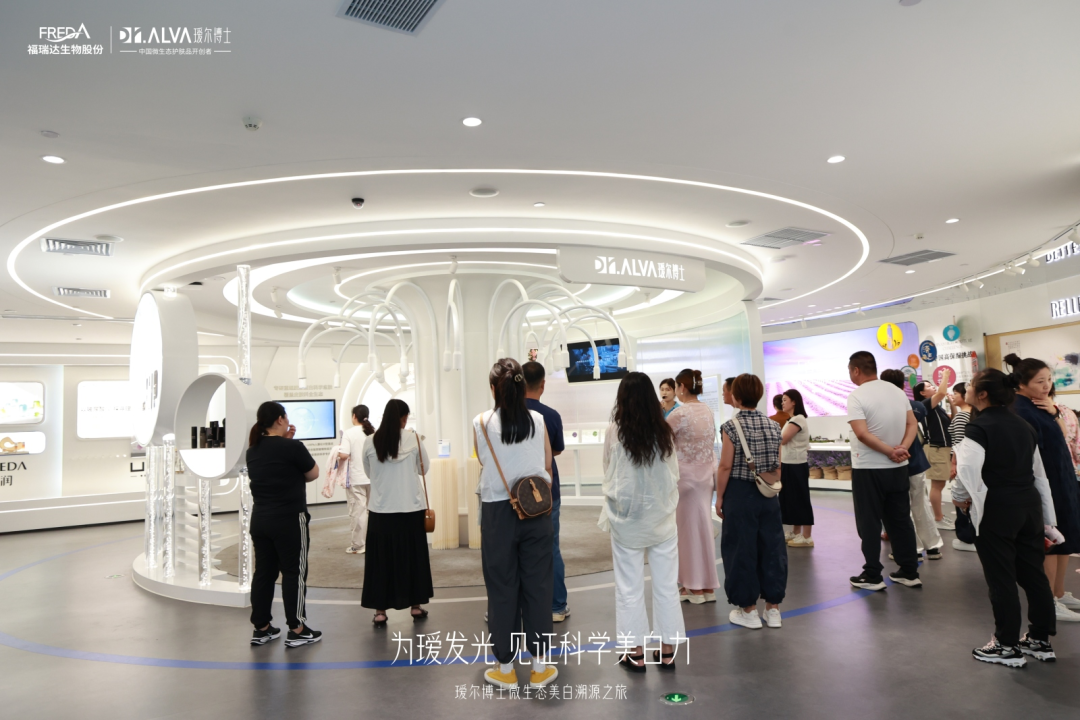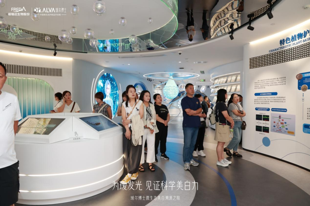 溯源之旅首站,客戶們走進(jìn)國內(nèi)首個美妝主題科技館 —— 福瑞達(dá)世界美妝科技館。一進(jìn)入展館,大家便被富有未來感的科技氛圍所吸引。借助工作人員的講解以及館內(nèi)的展品,大家深入了解了世界美妝的發(fā)展歷程,還有福瑞達(dá)為中國透明質(zhì)酸產(chǎn)業(yè)所作出的貢獻(xiàn)及取得的成果。此外,通過館內(nèi)趣味性十足的互動裝置,大家切身感受到了璦爾博士品牌的科技力量。