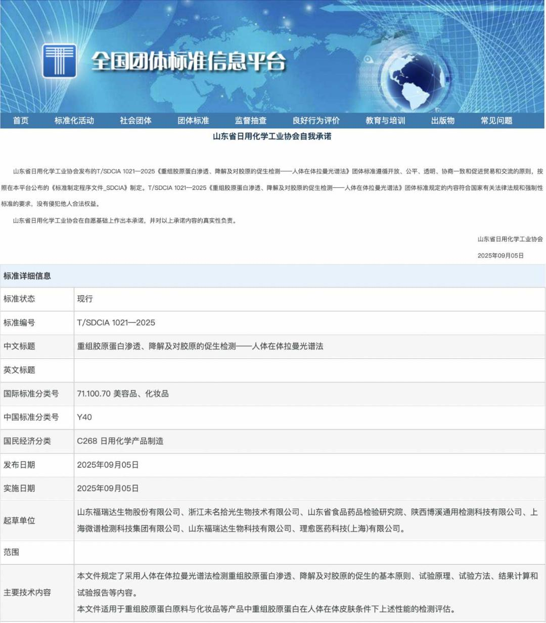 近日,由山東省日化行業(yè)協(xié)會(huì)歸口組織、山東福瑞達(dá)生物股份有限公司牽頭起草的《重組膠原蛋白滲透、降解及對(duì)膠原的促生檢測(cè)——人體在體拉曼光譜法》團(tuán)體標(biāo)準(zhǔn)正式發(fā)布實(shí)施,標(biāo)志著重組膠原蛋白皮膚滲透檢測(cè)有了新標(biāo)準(zhǔn)。